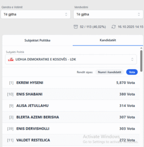 Kandidatët më të votuar për Asamblenë, nga LDK – me 46.02% të votave të numëruara