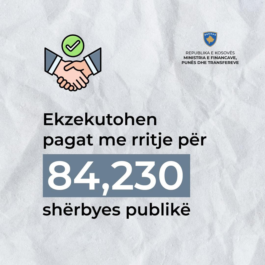 Ministria e Financave, Punës dhe Transfereve ka njoftuar se sot janë ekzekutuar pagat me rritje prej 55 euro për gjithsej 84,230 shërbyes publikë në organizatat buxhetore anembanë vendit.