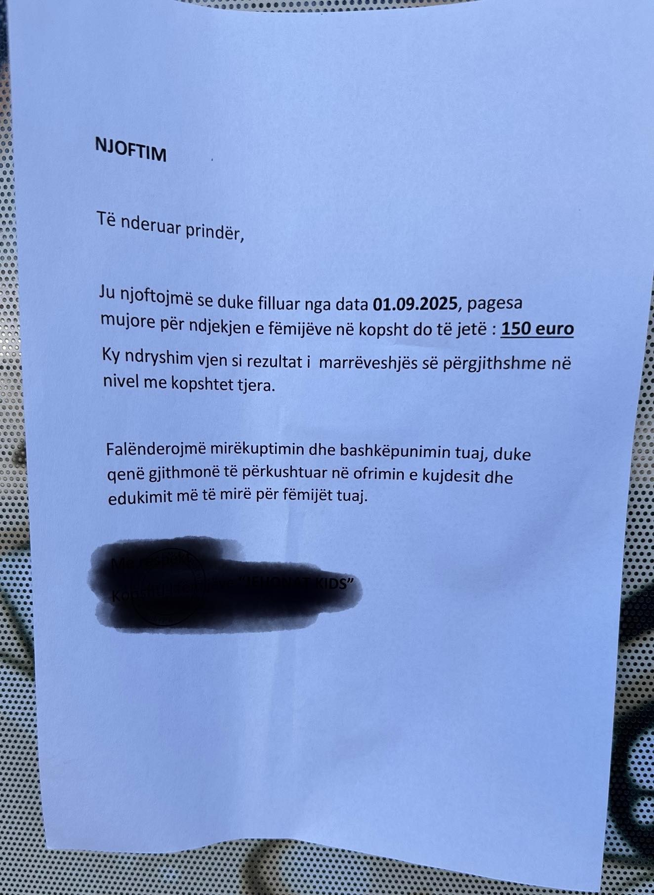 Një njoftim i shpërndarë sot nga një kopsht privat në Prishtinë ka shkaktuar reagime tek prindërit, pasi paralajmëron se duke filluar nga data 01.09.2025, tarifa mujore për ndjekjen e fëmijëve do të jetë 150 euro.