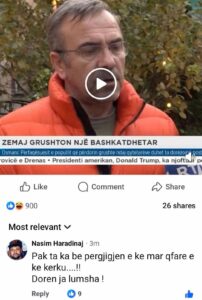 “Pak ta ka bo përgjigjen e ke mar qfare e ke kerku…!! Doren ja lumsha!”, thuhet në një koment të Haradinajt në Facebook.