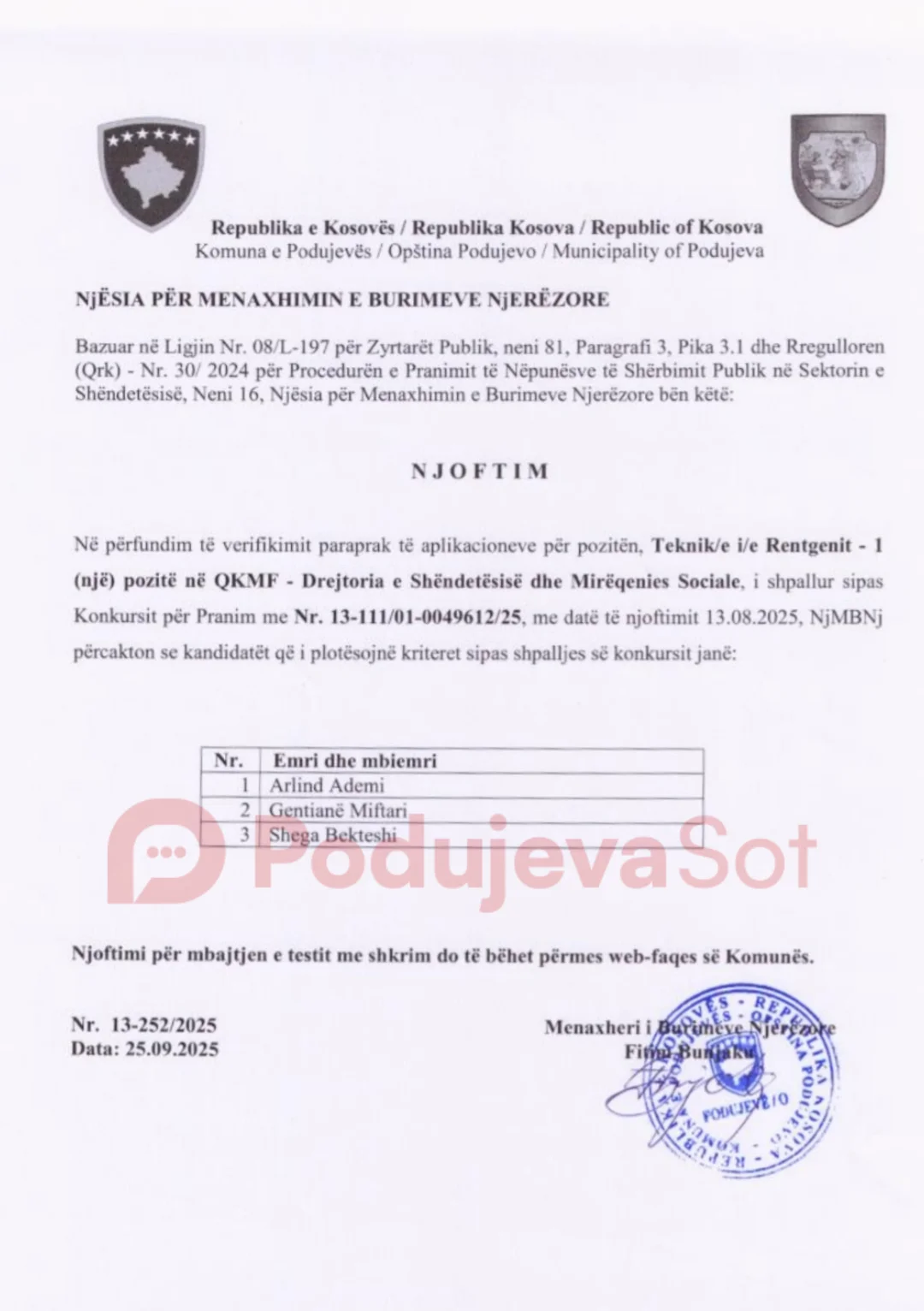 Komuna e Podujevës ka publikuar listën e kandidatëve që kanë kaluar fazën e parë për pozitën “Teknik Rëntgeni” në QKMF.