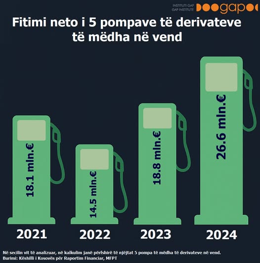 Sipas të dhënave të publikuara nga Instituti GAP, fitimi neto i pesë pompave më të mëdha të derivateve në vend ka arritur shifrën rekord prej 26.6 milionë euro në vitin 2024, duke shënuar një rritje të ndjeshme krahasuar me vitet paraprake.