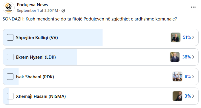 Ky sondazh paraqet opinionin e ndjekësve të Podujeva News në rrjetet sociale dhe nuk përfaqëson domosdoshmërisht rezultatin përfundimtar të zgjedhjeve, por jep një pasqyrë të tendencave aktuale të elektoratit në komunën e Podujevës.